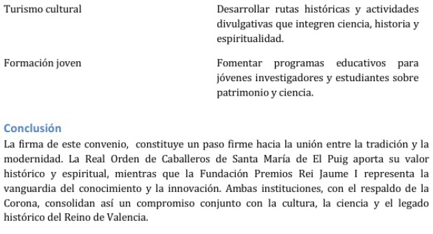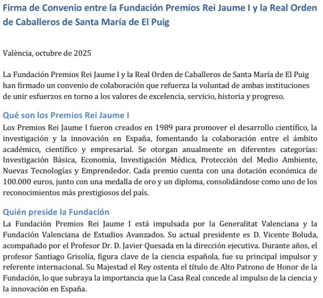Firma de Convenio entre la Fundación Premios Rei Jaume I y la Real Orden de Caballeros de Santa María de El Puig