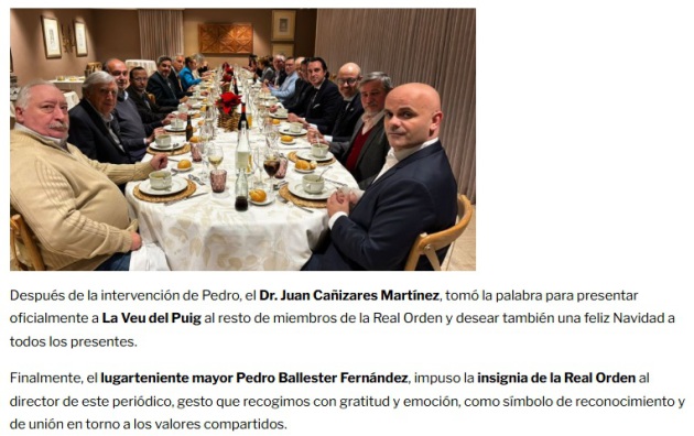Durante la velada se llevó a cabo la imposición del distintivo de la Real Orden al Dr. Julio Badenes, Cronista de El Puig de Santa María —sede de la Cancillería de la Real Orden— y