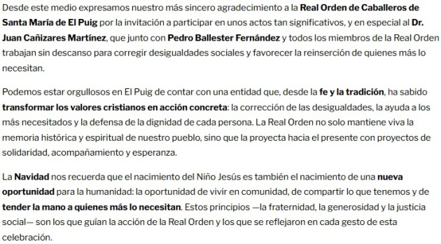 En un marco de solemnidad, tradición y profunda fe, se desarrollaron las celebraciones en honor a Santa María de El Puig, Patrona de la localidad y de la propia Real Orden de Caballeros que lleva su nombre. Los actos, que congregaron a una multitud de fieles y vecinos, contaron con la participación institucional y devocional de la Real Orden,