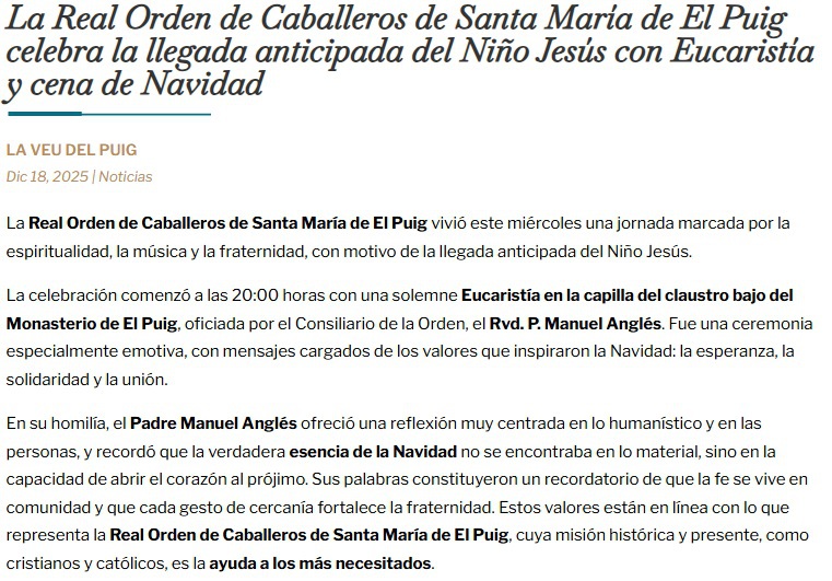 16 de octubre de 2025, la Real Orden de Caballeros de Santa María de El Puig celebró el acto de comienzo de curso, iniciando sus actividades con una solemne eucaristía presidida por el Padre Anglés,