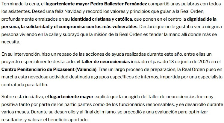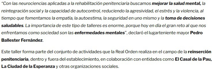 26 de septiembre de 2025 tuvo lugar la clausura del Taller de Neurociencias promovido por la Real Orden de Caballeros de Santa María de El Puig en el Centro Penitenciario de Picassent, en